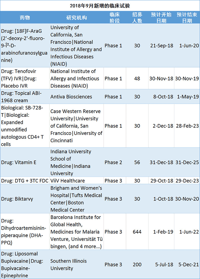 从2018年9月1日至30日,共有9个新发布的艾滋病新药临床试验。其中,处于1期的有4项,处于2期的有1项,处于3期的有4项。
