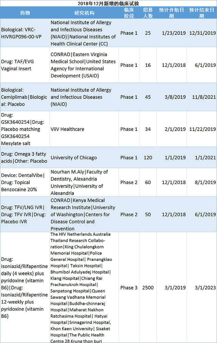 从2018年12月1日至31日,共有8个新发布的艾滋病新药临床试验。其中,处于1期的有5项,处于2期的有2项,处于3期的有1项。